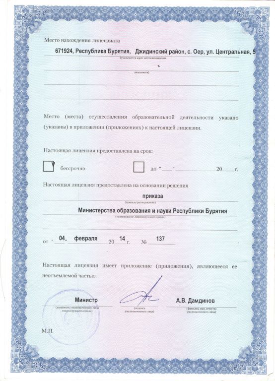 | Адрес местонахождения образовательной организации* | 671924, Бурятия Респ, Джидинский р-н, Оер с, Центральная, 5 |